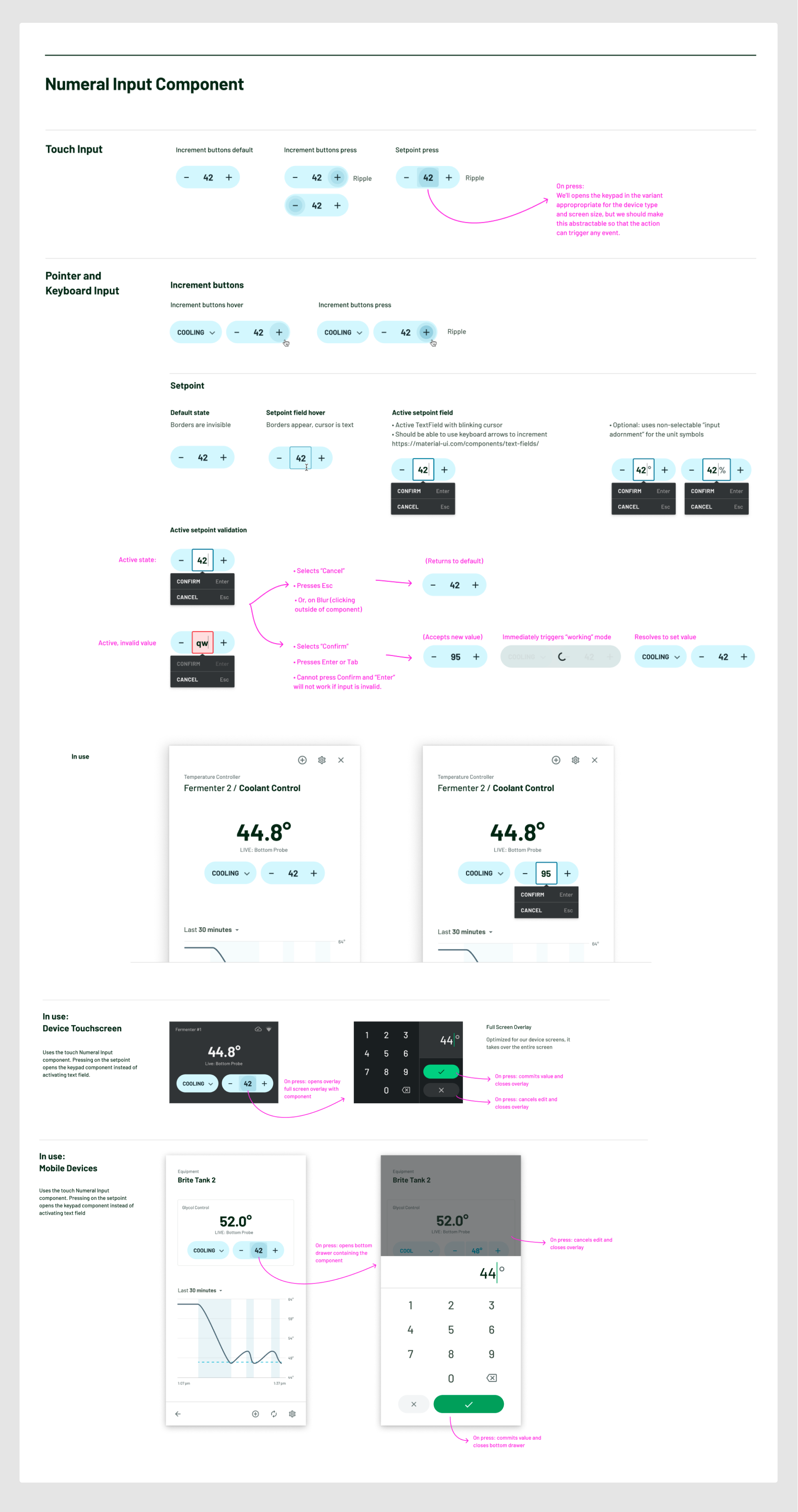 You'll notice that the design spec below focuses on a single component that's used across web, native mobile apps, and on our custom hardware running a Chromium-based UI. We wrote a custom React compiler that allowed us to maintain one version that automatically compiled to the correct usage, depending on device parameters. This allowed for faster styling and functionality updates.