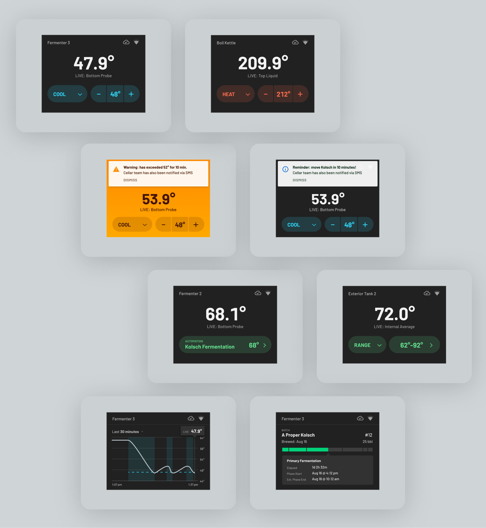 The ruggedized touchscreen device was installed on the production floor at breweries and distilleries, so the goal was making the display simple and legible from a distance. The limitations of a small screen meant that primary interaction tasks needed to be big and simple, and we offloaded non-critical tasks to the mobile and web UI.