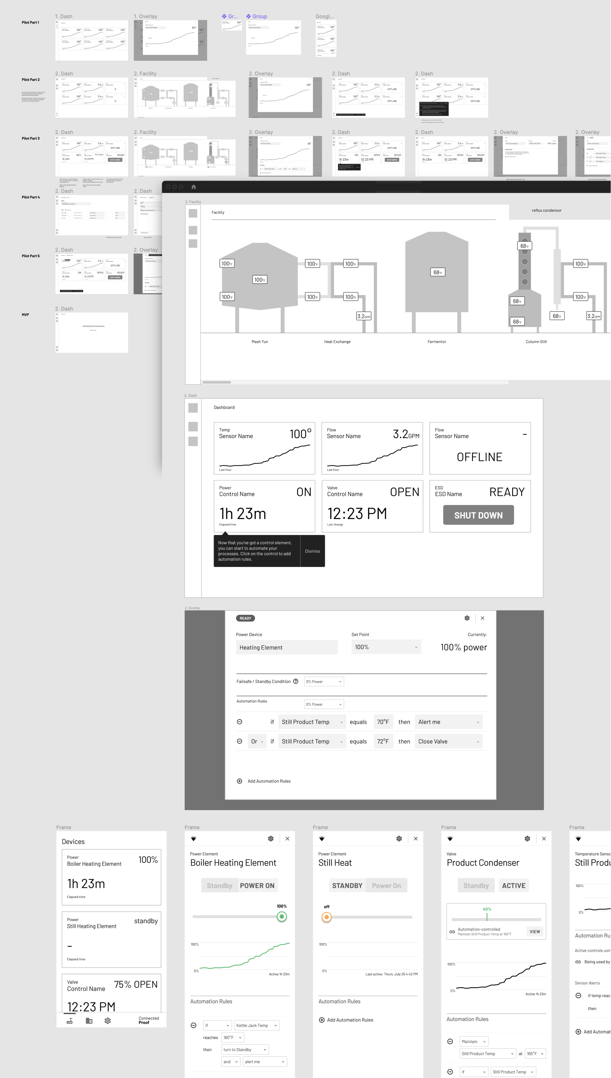 Once we had a direction for our first pilot, I got to wireframing the experience to quickly arrive at all of the software we'd need to build to support the MVP for this specific pilot installation. In order to force ourselves to really focus on an MVP, features and screens were all broken out into phases and anything that wasn't required for the pilot was noted, but explicitly not added to the wireframes.