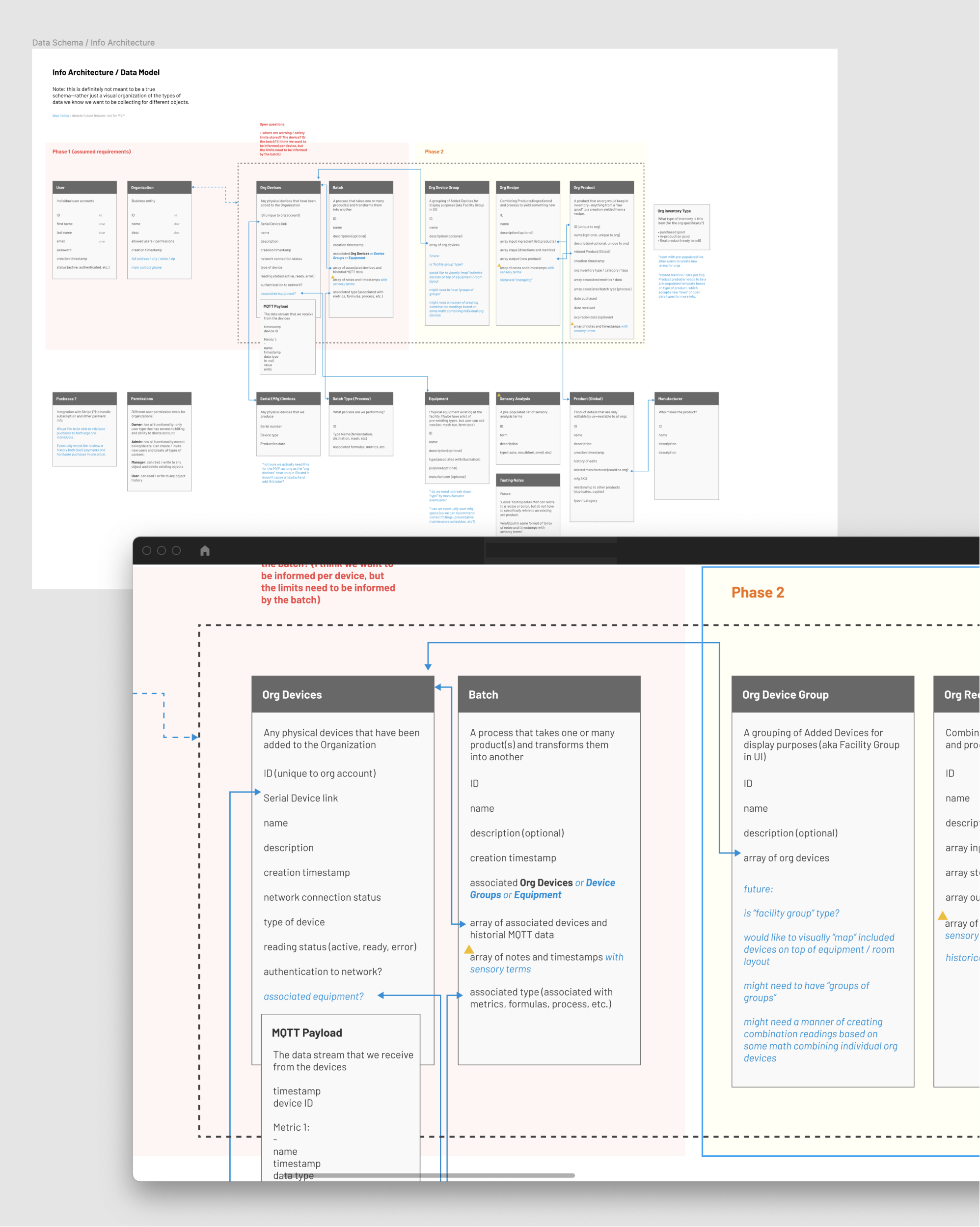 With an idea of the IoT platform we wanted to build in the short and long term, we set out to define our data model and platform's information architecture. We broke out the model requirements into broad phases (red and yellow boxes), with future ideas and open questions in blue. This represented the data we needed for both our cloud-based SaaS platform, and the broad MQTT information that our IoT devices needed to send and receive.