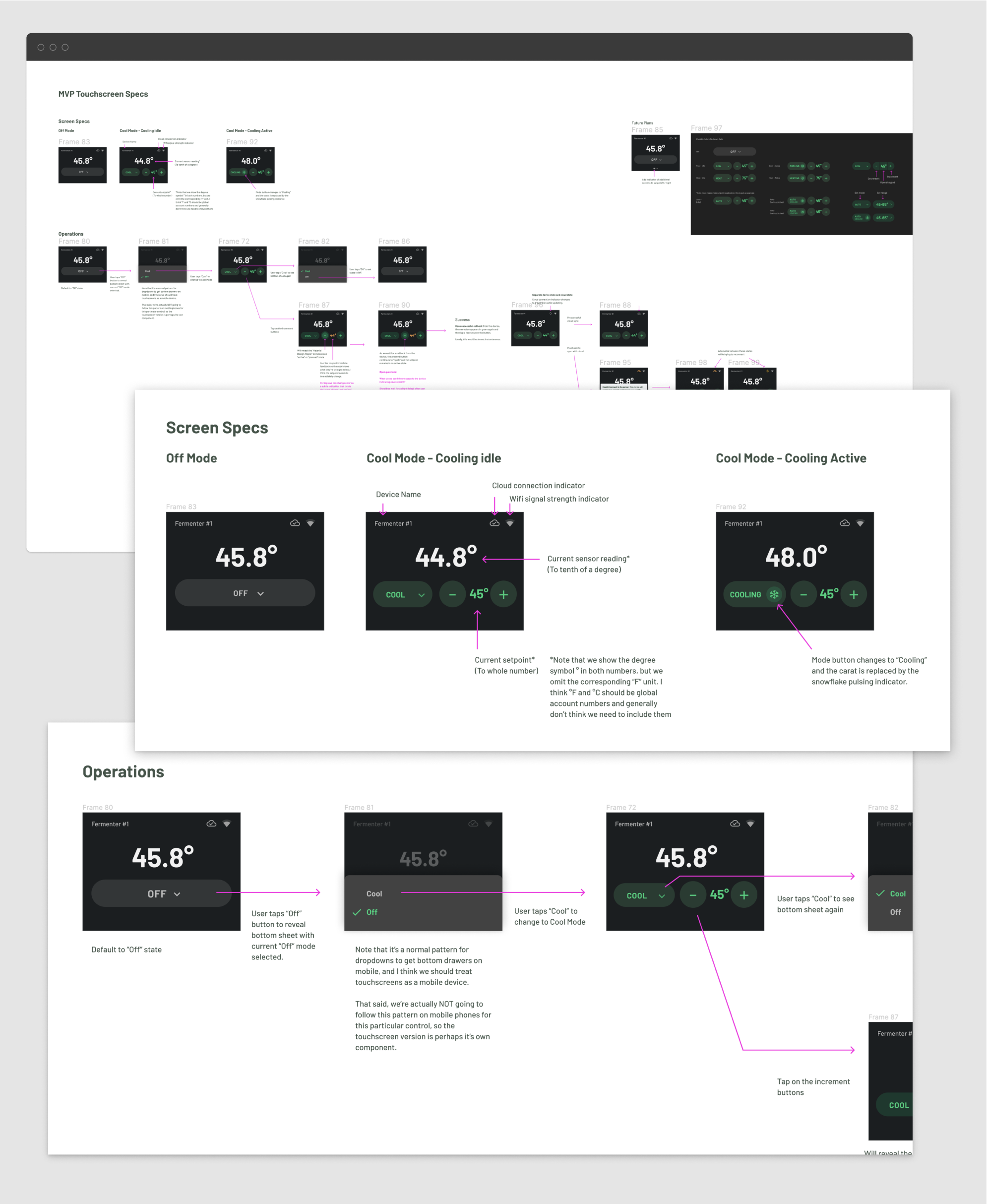 Below is another example of UX documentation that describes interaction intent for the touchscreen on our device. Even though we were a small three-person team, documenting design decisions helped get everyone on the same page in the design phase, and reduced confusion when it came time to build.